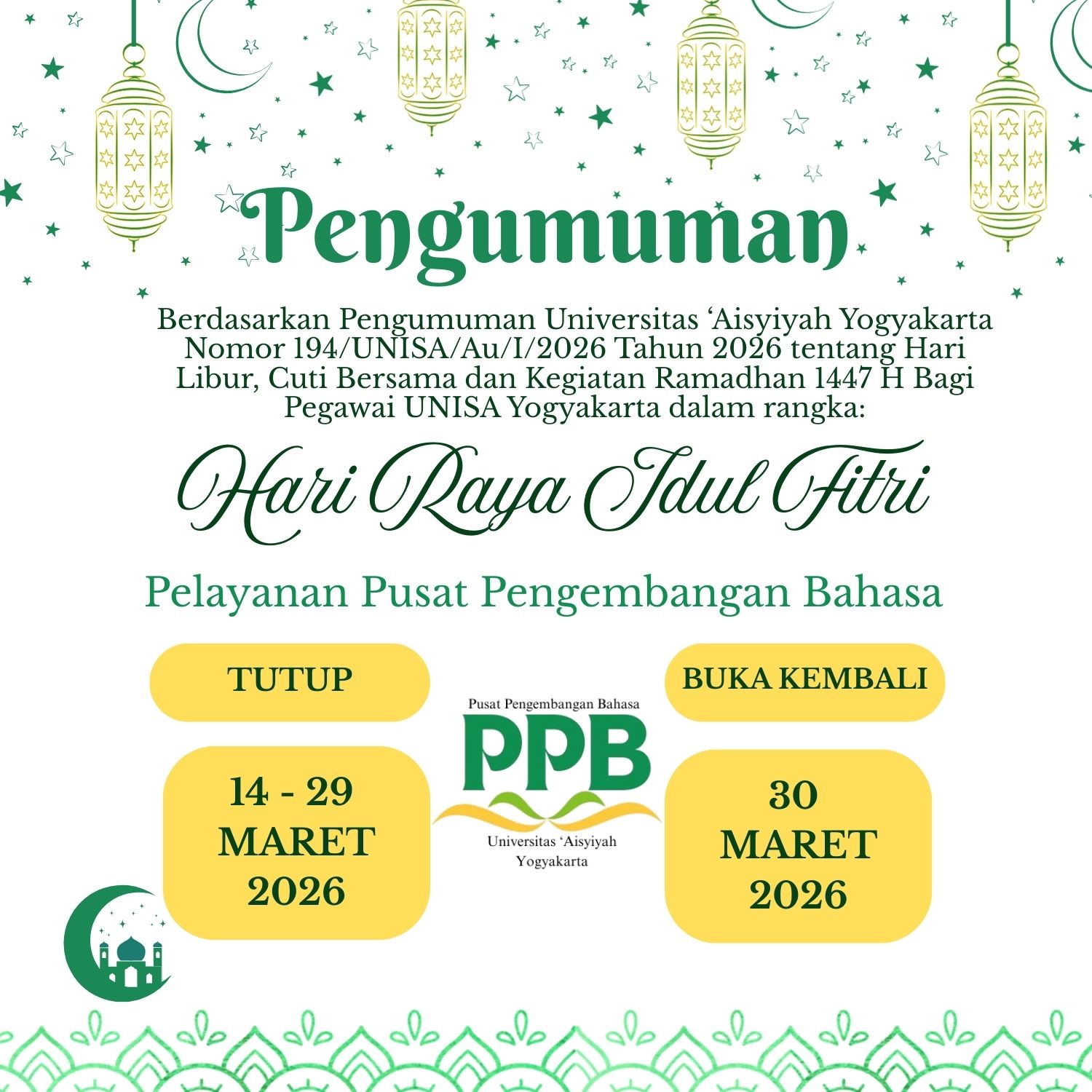 PENGUMUMAN LIBUR HARI RAYA IDUL FITRI by ppb operator | MarpmFri, 13 Mar 2026 17:17:51 +0700 13, 2026 | Pengumuman | 0 comments Submit a Comment Cancel replyYour email address will not be published. Required fields are marked *Comment * Name * Email * Website Save my name, email, and website in this browser for the next time I comment. Δ